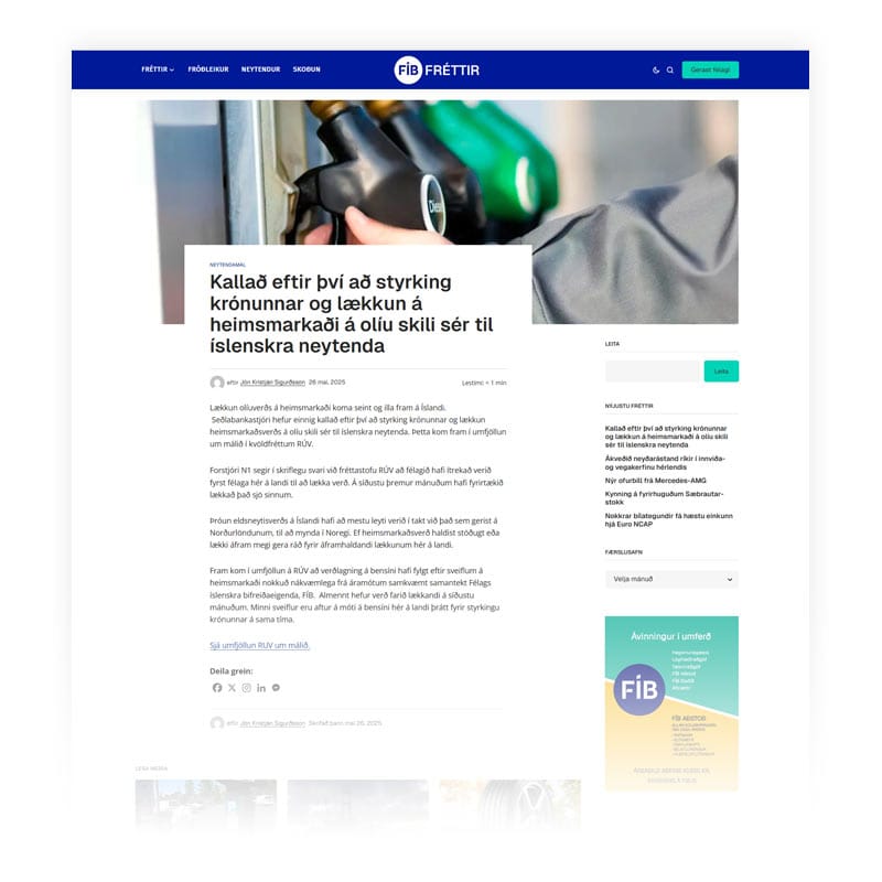 FÍB FréttirFÍB Fréttir er nýr vefur sem inniheldur gagnlegar og fræðandi upplýsingar fyrir bílaáhugafólk sem og meðlimi Félag Íslenskra Bifreiðareigenda. Vefurinn kappkostar að vera upplýsandi um málefni líðandi stundar, flytja fréttir og viðtöl. FÍB Fréttir